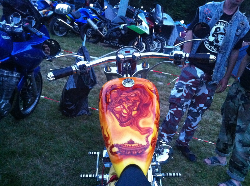 Nedalo mi to a musel jsem si sednou a napsat o tom co jsem viděl. Možná tím popudím proti sobě hodně lidí, ale budu upřímný. Mám moc rád malby na motorkách, jsou skvělé a vyjadřují styl majitele. Ale nemám rád choppery. Jsou to hrozný motorky, jezdí na nich většinou lakýrky, vousatí blbečkové, kteří si hrají na drsňáky a navěšují na své podivné stroje odporné a komerční cetky v americkém stylu. Možná si vyjedou někam za roh na sraz, kde se opijí, koupí si nášivku nebo třásně a ve kožené vestičce s cvočky a kýblem na hlavě si ráno bublají domů, třesouc se zimou těch pár kilometrů.