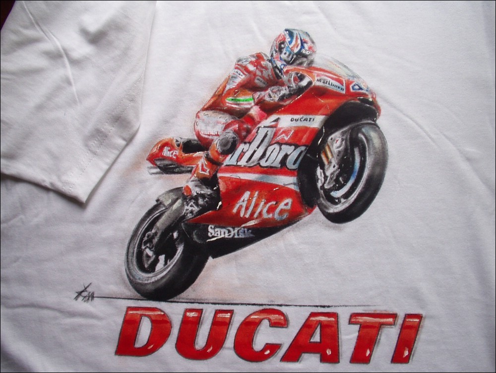 No není to tak úplná novinka, myslím tím novinka pro mě, protože v této oblasti byznisu-nebyznisu se pohybuju resp. maluju již tak15 let. Neznám nikoho jiného za ty léta, kdo by tohle dělal na této úrovni na trika a textil a dotáhl to do profi podoby za pár kaček. Ačkoli určitě je mnoho lidí, co má rádo malůvky, jako např. pan Svoboda z Brna, který maluje motorky GP fantasticky na papír.