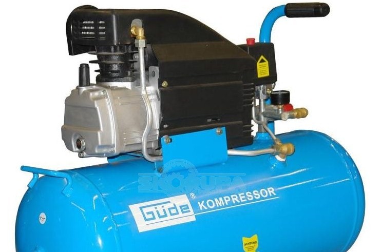 Kompresor u mě doma je od firmy Gude. Parametry : hmotnost 22 kg, výkon motoru 1,5 kW (2 koně), jednopístový kompresor, max sací výkon 210 l/min, skutečně dodávané množství cca 120 l/min., max. tlak 8 bar, bezolejový, vzduchová nádoba 25 litru, 1 vývod tlakového vzduchu, 2 manometry (jeden tlak ve vzdušníku, druhý redukovaný tlak za redukčním ventilem, tedy to co leze ven), tlakový spínač, redukční ventil, pojistný ventil, odkalovací ventil. Běžná cena tehdy 4.000,- Kč, v akci se slevou 2.990,- Kč, dnešní cena kolem 3.500,- Kč, u "dobrých" prodejců 5.000,- Kč. Součástí byl i tlakoměr na nafukování kol auta, ofukovací pistole, stříkací pistole s horní nádobkou, spirálová hadice.