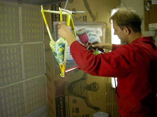 Práškové laky:princip nanášení těchto barev pracuje na principu elektrostatického náboje. Do rámu, který je zavěšen pevně nebo otočně v lakovacím boxu, je přiveden jeden pól. V trysce stříkacího zařízení nebo pistole je otočná hlavice, která se při tryskání barvy otáčí a vyrábí tak opačný náboj. Barva je pak přitahována k opačnému náboji v rámu. Výhodou tohoto systému je veliká rychlost nanášení barev a vysoká efektivnost nástřiku (při klasickém postupu, zejména na malých průměrech trubek, jako jsou například zadní šavle, je obrovský prostřik a tedy veliká spotřeba barvy). Nevýhodou této metody je snížená možnost použít na jednom rámu více odstínů.