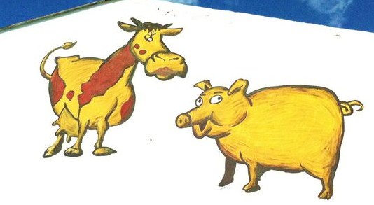 Je to takový menší úlet od lakování, malbě na přilbu či triko, ani to není malba sparťanských hodin do kabin FK Peruc. Toto je pro změnu spíše malba na zeď ve výšce několika metrů nad zemí. Když jsem byl požádán vymyslet něco na živočišné téma, kde jsou kravky i prasátka, nešlo neodmítnout. Aby byla výzdoba vidět z dálky, musela být obě zvířata pokud možno co největší a výrazná. Proto jsem také použil Urbanovo humorný styl, fasádní barvu a tónovadla.